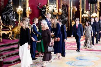 Después del presidente del Gobierno, pasaron por el Salón del Trono casi todos los ministros, con la ausencia de cinco, tres de ellos de Sumar: el titular de Economía, Comercio y Empresa, Carlos Cuerpo; el ministro de Derechos Sociales, Consumo y Agenda 2030, Pablo Bustinduy; la ministra de Sanidad, Mónica García, que este domingo inicia un viaje a Alemania para asistir a la 17ª Cumbre Mundial de la Salud World Health Summit; la ministra de Juventud e Infancia, Sira Rego, que se encuentra de viaje en Jordania, y la titular de Igualdad, Ana Redondo.