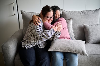 Esos ratitos les han ayudado a entenderse y a apoyarse porque, para Galve, el cambio ha sido fuerte: “Yo lo que más de menos echo es a mis compis, que los he tratado muy a gusto y ellos me han enseñado cómo hacer las cosas”. Así que los invitaron a casa a cenar. “Me emocioné un poco al verlos a todos aquí”, recuerda. A Galve le han concedido el servicio de catering, pero hasta el momento se han organizado ellas: “Ana sí sabe hacer sus alimentos, lo que necesita es que la acompañe para que ella esté segura de lo que está haciendo. Entonces, si le falta la sal, le oriento”. Aquí, ríen, han encontrado más obstáculos. “Me pidió que la ayude a hacer una tortilla de patatas y yo no sé, yo soy de Colombia, entonces tuvimos que mirar un tutorial”, narra Vera. En todo lo demás, son independientes. Vera trabaja en una tienda de zapatos y estudia un máster, y Galve acude todas las mañanas a la asociación donde se forma para poder trabajar: “Hacemos actividades en el ordenador, en el Excel, cosas de cocina...”.