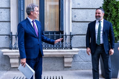 Génova también rema en favor de un acuerdo que pretende que sea rápido para interferir lo menos posible en el próximo ciclo electoral. Feijóo y Abascal hablaron el pasado martes, y la conversación que mantuvieron “con buen tono” elevó las expectativas de Génova de que sea posible alcanzar un acuerdo. Pero los populares son conscientes de que Vox tiene la sartén por el mango. El jueves por la noche, Abascal y Feijóo coincidieron en el acto de aniversario de OKDiario en Madrid. El líder de la extrema derecha avisó ante los micrófonos al del PP de que jugaba a una “lotería muy peligrosa” con sus cambios de actitud hacia Vox. En el evento, según fuentes de Génova, no hablaron.