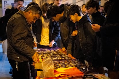 Fuera de la iglesia, el vendedor de imaginería preconstucional también ha hecho su noche. Los carnets de Franco se vendían a tres euros la unidad, como otros recuerdos de Primo de Rivera. En un momento dado, el acosador de las activistas de Femen ha expuesto una enorme bandera con el águila de la dictadura. ¡No saques el águila! ¡Que te detienen!“, le ha recomendado un hombre entre risas mientras volvía a tronar el Cara al Sol.