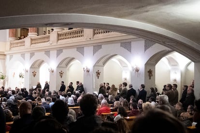 A las siete y media ya no había asientos libres en la iglesia. El primer golpe era visual, aderezado por el fuerte olor a incienso que impregnaba el ambiente. “Esto no lo esperaba, no cabe un alfiler, Conchita”, decía sorprendida una octogenaria a una amiga. En cada uno de los 36 bancos en la planta central, colocados en dos hileras, se apretujaban seis o siete. Alrededor de otras 200 personas han seguido la misa de pie en los laterales y en el piso superior, donde eran mayoritariamente de la Generación Z y, en menor medida, millenials.