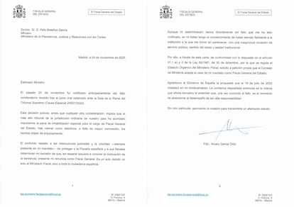 En la carta remitida a Bolaños, García Ortiz explica que la decisión de adelantar su salida antes de que el Supremo ejecute la inhabilitación, y “sin esperar siquiera a conocer la motivación de la sentencia”, se debe a su “profundo respeto” a las resoluciones judiciales y a su voluntad “siempre presente, de proteger a la Fiscalía española”. “Aunque mi determinación deriva directamente del fallo que me ha sido notificado, en mi haber tengo el convencimiento de haber servido fielmente a la institución a la que me honro en pertenecer, con una inequívoca vocación de servicio público, sentido del deber y lealtad institucional”.