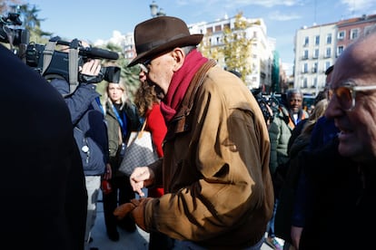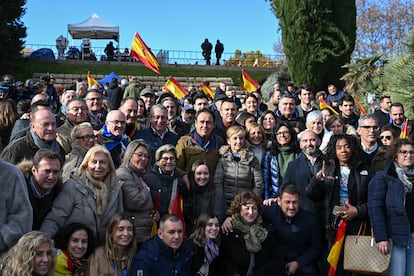 Cartel con la imagen del presidente del Gobierno, Pedro Sánchez, en la protesta en el Templo de Debod de Madrid.Juanjo Martín (EFE)José María Aznar, expresidente del Gobierno y del Partido Popular, a su llegada a la concentración.Juanjo Martín (EFE)Un manifestante porta un cartel con el lema "Independencia judicial" en la concentración de este domingo en el Templo de Debod de Madrid.Juanjo Martín (EFE)El exportavoz parlamentario de Vox en el Congreso Iván Espinosa de los Monteros asiste a la protesta convocada por el Partido Popular, este domingo, en el Templo de Debod.EUROPA PRESS (EUROPA PRESS)El presidente de la Generalitat Valenciana, Juan Francisco Pérez Llorca (en el centro), posa con manifestantes a su llegada a la concentración, este domingo en el Templo de Debod de Madrid.Juanjo Martín (EFE)El fundador de VOX Alejo Vidal-Quadras, a su llegada a la protesta.Juanjo Martín (EFE)La diputada del PP Cayetana Álvarez de Toledo llega al Templo de Debod para participar en la concentración.Juanjo Martín (EFE)María del Mar Blanco, senador del PP, llega para participar en la concentración convocada por el partido en Madrid.Juanjo Martín (EFE)El filósofo Fernando Savater (en primer término), a su llegada a la protesta en el Templo de Debod.Juanjo Martín (EFE)