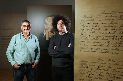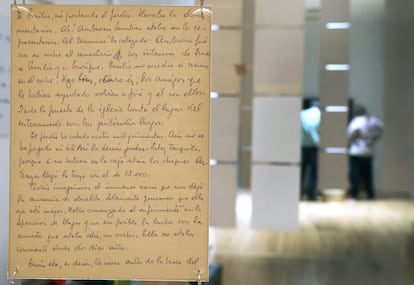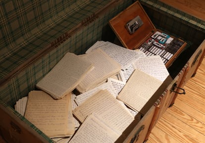 María Fernández Grandizo se quedó huérfana y viuda en apenas tres meses de 1936. En agosto mataron a su padre, y en noviembre, a su marido, ambos republicanos. En 1952 fue detenida con sus dos hijos, gemelos, Emilio y Manuel, por acoger en su casa a otro pariente que trataba de organizar un movimiento antifranquista. María estuvo casi dos años presa. Manuel cruzó a Francia escondido en el maletero de un coche y finalmente, se exilió en México. Emilio fue exonerado. Para tratar de mantener unidos los restos de aquella familia destruida que amanecía en dos continentes distintos, María escribió a Manuel 1.500 cartas. Una cortina de un millón de palabras que los visitantes de la exposición El cuerpo errante, en Casa América (Madrid) podrán atravesar hasta el próximo 14 de febrero para sumergirse en una dimensión menos conocida del exilio: la cotidiana y sentimental, la de hombres y mujeres sin apellidos célebres, pero con heridas comunes. “Mucha gente”, explica el antropólogo Jorge Moreno, comisario, junto a Julián López, de la exhibición, “se está perdiendo la historia de España que está en las casas, en los desvanes, en los salones… El exilio se ha contado a menudo desde el punto de vista de personalidades importantes. Nosotros queríamos hacerlo desde las pequeñas cosas hasta tejer una geografía emocional de afectos, deseos, frustraciones y esperanzas". El objetivo es que el visitante se ponga en la piel de los que tuvieron que huir y en la de los que se quedaron. Por eso la muestra invita a participar: atravesando las cartas de María que cuelgan del techo; abriendo un armario; descubriendo que una postal aparentemente turística escondía un mensaje trascendental - “Estoy vivo”- y una carátula de canciones populares suecas, un disco de temas de la resistencia grabados en el baño de una casa.