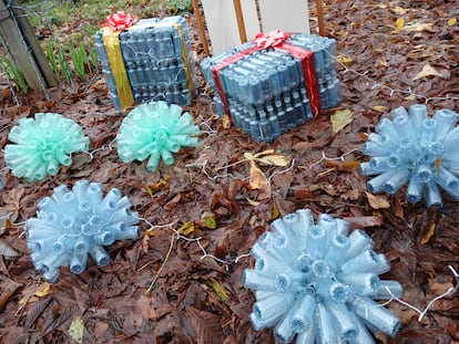 Tan bien quedó en 2024, con un árbol y una especie de velas, que ahora han multiplicado sus creaciones: completaron el árbol gigante de cinco metros, 10 árboles de 2,5 metros, arbolitos para las vallas de los parques, estrellas con las botellas de litro y medio, con las pequeñas una especie de bolas y muchas cajas de regalo ―con su lacito y todo―, como si Papá Noel o los Reyes Magos se hubieran esmerado con el núcleo. Todo a base de 15.000 unidades y más que se han quedado sin utilizar porque, pese al esfuerzo denodado de los voluntarios, no ha dado tiempo a usar todo el material. También dan una segunda vida a ropa, calderos de pinturas, tuberías viejas o palets que sirvan como estructuras o sostenes del abundante plástico.