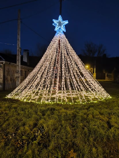 Tejados de pizarra, paredes de piedra y un árbol de Navidad de cinco metros de altura hecho de plástico. También estrellas, cajas envueltas para regalo, pequeños árboles en cada esquina o en los parques, bolas, cogollos a modo de copos de nieve o guirnaldas. Más de 15.000 botellas de agua vacías tienen la culpa de que San Esteban de Valdueza (Ponferrada, León, 30 habitantes en invierno) se haya ahorrado la inversión en decoración navideña para adornar las calles de la aldea con ese material tan presente en el día a día, que durante meses el vecindario ha ido recopilando para darle formas para las Pascuas. La iniciativa comenzó en 2024 y este invierno se ha multiplicado gracias a la implicación popular, con meses trabajando el plástico y buscándolo en bares cercanos. La alcaldesa de esta pedanía, Diana García, valora el empeño social por lucirse en Navidad en una iniciativa sostenible, ecológica, comunal y barata: “Ni nos planteamos poner adornos convencionales, en invierno somos 30”.