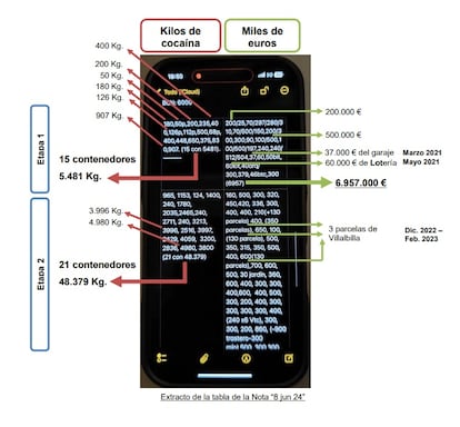 Este documento policial, fechado el 17 de diciembre y al que tuvo acceso EL PAÍS, describe la presunta estructura criminal urdida para la importación del estupefaciente desde Sudamérica. Y además, a través del análisis del contenido hallado en el móvil del exjefe de la UDEF, los investigadores lo vinculan con múltiples cargamentos de cocaína. Entre otro material, Asuntos Internos ha localizado múltiples notas donde Sánchez apuntaba de forma detallada los presuntos kilos de droga “introducidos” mediante contenedores marítimos, así como los pagos recibidos de la trama a cambio de su ayuda. En total, estiman que percibió más de 32 millones de euros.