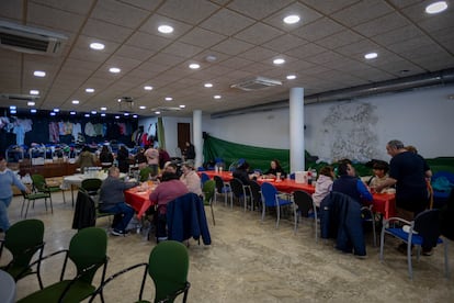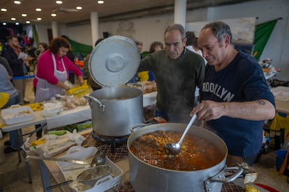 El menú de este martes en el salón multiusos de Zahara de la Sierra es “potaje de hermandad”, como lo bautiza en un golpe de ingenio la voluntaria Luisa Ruiz. Tiene habichuelas, chorizo, morcilla, su poquito de pringá y su majao de tomate, lo que es un guiso andaluz de toda la vida. Pero el nombre le viene por las manos que lo han preparado. Un batallón de mujeres del centro de mayores de Zahara (1.400 habitantes, Cádiz) y un grupo de vecinos de Grazalema, ese pueblo que, desde que les desalojaron por culpa de las borrascas que asolan la provincia, desembarcó en parte en el municipio vecino más cercano. “Somos pueblos hermanos desde hace muchos años, ahora no sabemos cómo agradecerles lo que están haciendo por nosotros”, explica la grazalemeña Loli Terreño, una de las autoras de ese guiso recién nombrado.