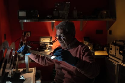 “Me gusta decir que este laboratorio es como un hospital en el que curamos películas. En la mayoría de los casos, cada una de esas películas es única, como con las personas, no hay más copias, por lo que la responsabilidad es grande. Ahora, además, dejamos abierta la puerta del quirófano para quien quiera asomarse”, explica Miguel García. Su cargo oficial es jefe de restauración y conservación de la filmoteca; en la práctica, es el alma de esta institución, a la que lleva ligado desde su apertura en 2004, y en la que ejerce de técnico, proyeccionista, historiador, museógrafo e investigador, por enumerar solo algunas de sus funciones.