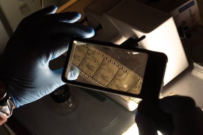 No son las primeras cintas que Miguel García restaura en el centro murciano, pero sí serán las primeras en las que todo el procedimiento se lleve a cabo con medios propios, sin tener que depender de laboratorios externos. El proceso, explica el experto, es completamente artesano: el primer paso es descontaminar de hongos y bacterias el negativo, fotograma a fotograma, con bastoncillos de algodón empapados en químicos. Con focos potentes y lupas para no perder detalle. Y con paciencia, mucha paciencia. Este proceso de limpieza, que García ya llevaba a cabo en la filmoteca regional antes de que existiera el actual laboratorio, le ocupó un total de 10 años para poner a punto los 16.000 fotogramas de la cinta Míster Yo en la Vega Murciana, una grabación de 1929 de José Gallego, que se reestrenó en 2024 con motivo del 20 aniversario de la institución. “Tampoco me dedicaba el día entero a eso”, le resta importancia el técnico, entre risas.