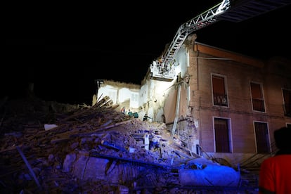 Los bomberos trabajan todavía en el rescate de una persona tras caerse una vivienda ubicada en la Plaza Mayor de la localidad