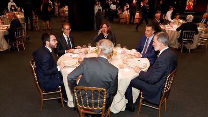 El rey Felipe VI, el presidente Pedro Sánchez y el jefe del Ejecutivo catalán, Pere Aragonès, cenan junto a Ada Colau, alcaldesa de Barcelona, el presidente de Fira de Barcelona, Pau Relat, y Mats Granryd, director general de GSMA. En vídeo, parte del discurso de Felipe IV en la cena inaugural del MWC21 de este domingo.Vídeo: FRANCISCO GÓMEZ (CASA DEL REY)