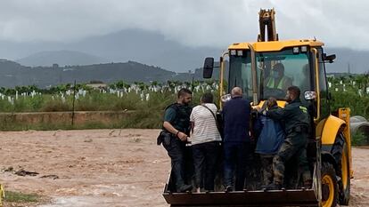 “Ha sido en dos minutos”, ha relatado Juan Ciudad, al que han tenido que sacar de su coche después de asegurarlo con cuerdas, dada la fuerza del agua que, desbordada de un barranco, ha anegado la carretera. En esos momentos apenas caía agua, por lo que no ha sido una conducción temerosa, sino que la tromba ha llegado por tierra, desbordada, rugiendo. “Hemos pasado miedo, sí. El agua iba subiendo por el coche y mi marido está recién operado”, cuenta Conchita Rollad, quien iba a iniciar este miércoles sus vacaciones. Ellos, como otras cuatro personas, han sido rescatadas y posteriormente trasladadas en la pala de una excavadora hasta un punto seco. Uno de ellos ha tenido que ser atendido por los servicios médicos. Al lugar, donde a primera hora de la tarde del miércoles seguía lloviendo copiosamente, se han desplazado siete dotaciones de bomberos.