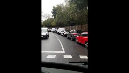 Las imágenes hablan solas. Un autobús urbano circula unos 100 metros pisando una línea continua y en dirección contraria por la calle del Santuari de Barcelona. El carril por el que debería conducir está ocupado por coches aparcados. Mal aparcados. Como indica una señal de tráfico al inicio de este tramo, solo pueden estacionar de 22 horas a 7 horas. La prohibición se cumple los días laborables, pero los fines de semana, sistemáticamente, hay vehículos aparcados. Quien cuenta todo esto es Paco Benavente, conductor de la línea V19, que como la 22, tiene parte del recorrido por esta empinada zona del barrio del Carmel.