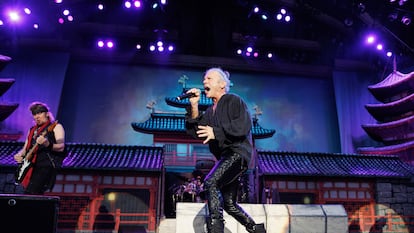 Según cómo era tentador no mirar a escena y dirigir los ojos a esa masa que dejaba ver sus brazos como un juncal electrizado. Sin apenas móviles. Y eso que hubo pirotecnia, un Ícaro imponente, un lanzallamas doble manejado por Dickinson a dos manos, humo para enturbiar Londres, fuego al por mayor, disfraces, una jaula donde Dickinson cantó ya melena al viento y con camisa blanca, un Belcebú hinchable y un desfile de imaginería que pese a su barniz tétrico demandó ser leída con una sonrisa. El paraíso heavy consumido a escala estadio, lo que jamás antes había conseguido el grupo, frecuentador de recintos más reducidos.