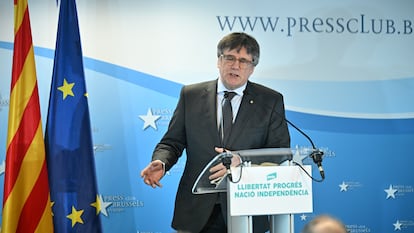 Carles Puigdemont avisa a Junts per Catalunya que su regreso a Cataluña puede demorarse aún un tiempo. “Tal vez mucho”, ha vaticinado el expresidente de la Generalitat, durante una comparecencia ante los diputados del partido que han viajado hasta Bélgica para tener una reunión con él. Pendiente aún de poderse beneficiar de la aprobación de la ley de amnistía, Puigdemont ha hecho balance de la situación que sufre su formación, con un liderazgo a distancia y escasa representación en puestos de poder, y ha reprochado que Junts es víctima de una campaña de desprestigio para erosionar su fuerza electoral. “Hay una pinza, en la que confluyen todos, para dificultarnos la vida”, ha dicho.