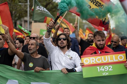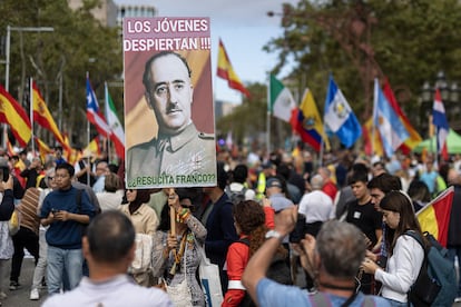 La manifestación ha arrancado sobre las 12.00 de este domingo en el cruce entre el paseo de Gràcia y la calle Provença y ha descendido, muy lentamente, hasta la plaza de Catalunya. Atrás quedan concentraciones de otros 12 de octubres mucho más multitudinarias. Justo antes de que echara a andar la marcha, este domingo, han comenzado los pequeños incidentes ante la presencia de emblemas preconstitucionales o carteles de nostálgicos reivindicando la figura del dictador Francisco Franco. Nada más comenzar la protesta, una señora ha mostrado un cartel con la imagen del dictador y la proclama: “Los jóvenes despiertan. Resucita Franco”. Los encargados del orden de la marcha —ataviados con chalecos amarillos— han echado a la señora de la marcha mientras gritaba “viva España. Abajo el comunismo de la Moncloa”. Cuando lo hacía, uno de los encargados del orden se justificaba: “Sé que está en la calle pero esto es una manifestación. La gente va a sacar fotos y nos van a decir fachas. Yo a ese señor (refiriéndose a Franco) le tengo veneración, pero no podemos comprometer la protesta”. No ha sido el único altercado que ha habido en la marcha. La organización ha intentado apartar de las primeras filas a las personas que llevaban la bandera española franquista con el escudo del águila pese a que justo detrás de los coches de la Guardia Urbana, encabezando la manifestación, circulaba un vehículo con una bandera preconstitucional.