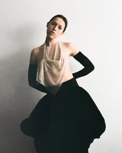 También es un recién llegado a la ciudad Marc Aleixandri, nacido en La Ràpita (Tarragona), pero con años de experiencia en el mundo de la moda, donde ha trabajado en el equipo de Palomo Spain durante seis años. Su nueva firma, Alexandri Studio, sigue la estela de la ropa sin género que ha desarrollado hasta ahora junto al diseñador que sorprendió hace casi una década vistiendo a hombres con volantes y transparencias, prendas que rompían las convenciones de género. “La firma nace de la necesidad personal de expresar mis ideas, no solo la parte estética sino teórica”, detalla Marc Aleixandri. Se considera una persona no binaria y diseña sin esta tradicional división masculino-femenino en mente. Para ello, las volumetrías y patrones se adaptan a diferentes tipologías de cuerpos.