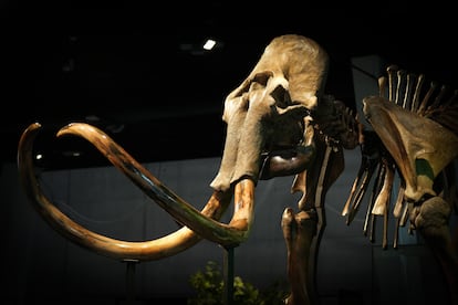 Era imposible no pensar en la imagen evocada por Brusatte esta mañana ante el espectacular esqueleto de mamut lanudo (Mammuthus primigenius) de CosmoCaixa que tras un largo e insólito periplo, ha quedado instalado definitivamente en el ámbito Evolución del museo (en la sala Universo, frente al Bosque inundado), en buena compañía, pues tiene otros restos paleontológicos a su alrededor y a tiro de piedra una representación de nuestros antepasados prehistóricos que cazaban a su especie.