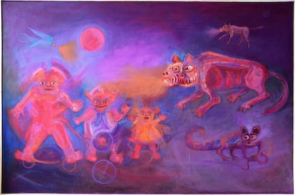 En los primeros pasos de la exposición, las criaturas fantásticas de Alberto Quintanilla se imponen. Llenas de color, movimiento y ambigüedad, sus obras combinan trazos de apariencia infantil con la potencia simbólica de las mitologías andinas. Figuras, animales y deidades se entrelazan en composiciones abiertas, de contornos fluidos, como si estuvieran en constante metamorfosis.