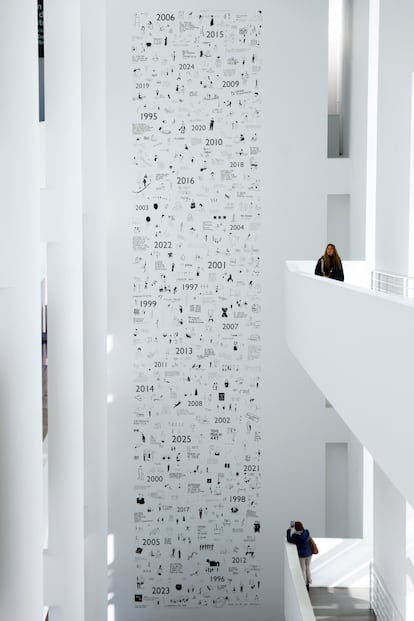 Como en una danza de estorninos, el Macba ha puesto a dialogar a cincuenta artistas de su colección con la mirada fijada en las múltiples formas de ser que caben en el Museo de Arte Contemporáneo de Barcelona, ese inmenso cubo blanco inmaculado que ha dado nombre a una plaza del Raval sin dejar a nadie indiferente, y que este noviembre cumple treinta años. Con esta exposición, donde se ponen al mismo nivel los internacionales Jean-Michel Basquiat o Matt Mullican con locales como Onofre Bachiller o Silvia Gubern, empiezan los festejos del aniversario de este gran equipamiento cultural, obra del arquitecto Richard Meyer. Está dirigido actualmente por Elvira Dyangani Ose, quien ha defendido en la presentación que un espacio así se debe valorar más allá de las cifras de visitantes, que fueron 261.500 en 2024. Para la ocasión, la artista Clàudia Nubiola ha pintado un gran mural en la prístina y larga pared del atrio, dónde con textos y dibujos en negro sintetiza las tres décadas del museo.