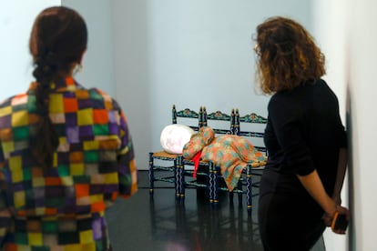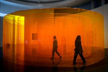 La segunda sala, bautizada Existir desde la carne, piensa el sujeto desde su lado corporal, reivindicando el poder de la materia. Es así en el laberinto amarillo anaranjado de Àngels Ribé (Barcelona, 1943), que se puede recorrer en un juego que enfrenta al visitante con su propia corporalidad, y que la artista instaló por primera vez en 1969 en Verderonne, y en 2011, lo volvió a montar para el Macba. Alrededor, se despliegan los autorretratos corporales de Julia Montilla (Barcelona, 1970); una figura femenina con partes sobredimensionadas de Elena Paredes (Rosario, Argentina 1911-2006) o un busto de mujer de la serie Electrotérmicas de la inclasificable Amèlia Ribera (Barcelona, 1928-2019).