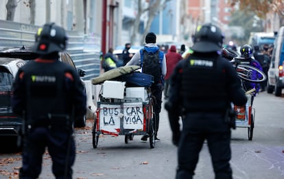 Los habitantes del B9, la mayoría migrantes subsaharianos, han empezado ya a recoger sus pertenencias bajo la vigilancia de un amplísimo despliegue policial que incluye efectivos de la policía local, los Mossos d’Esquadra y el Cuerpo Nacional de Policía, este último con competencias en materia de extranjería. Ni la protesta convocada a primerísima hora por las organizaciones que dan apoyo a los residentes del instituto ni los recursos judiciales de último minuto han hecho virar un desenlace que quedó fijado el pasado 4 de diciembre. Ese día, la jueza accedió a la petición del Ayuntamiento de Badalona de entrar al local y echar a los ocupantes en un plazo máximo de 15 días y en horario “diurno”. Es la solución que el alcalde, Xavier García Albiol (PP) llevaba meses reclamando con el argumento de que los migrantes del B9 son en su mayoría delincuentes y causan problemas de inseguridad e incivismo.