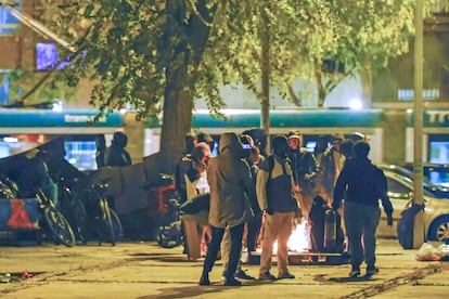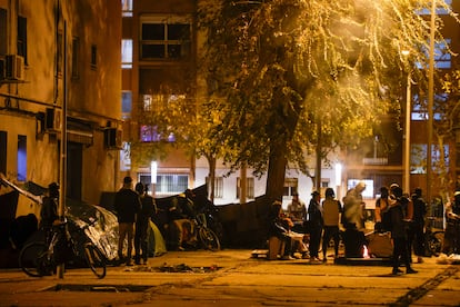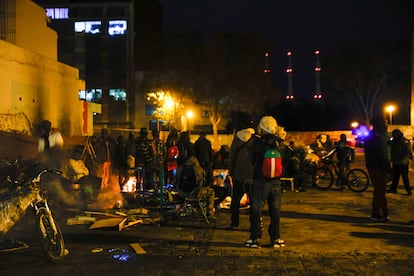 La imagen de la plaza al anochecer es desoladora. Algunos migrantes se protegen del frío alrededor de una hoguera. Otros pasean entre las tiendas de campaña que les han prestado. Los hay que regresan de recoger chatarra, principal ocupación de buena parte de los miembros de este colectivo, muchos de ellos en situación irregular en España. Younouss, un electricista senegalés que ejerció cierto liderazgo en el interior del B9 como portavoz y mediador, contempla la escena con resignación e insiste en una idea que ha repetido en los últimos meses, a medida que las resoluciones judiciales iban haciendo cada vez más inminente el desalojo. “¿De verdad pensaban que echando a la gente íbamos a desaparecer? Pues no. Mira esto. ¿Qué es esto? Es una vergüenza. Y no va a parar hasta que haya una solución por parte de la administración”, cuenta.