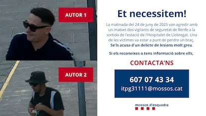Los Mossos d’Esquadra han lanzado un mensaje a través de las redes sociales con la fotografía de dos hombres que agredieron con un machete a dos vigilantes de seguridad de Renfe a la salida de la estación de tren de L’Hospitalet de Llobregat el pasado 24 de junio. La policía pone a disposición de la ciudadanía un número de teléfono, el 607074334, y una dirección de correo elecrónico, itpg31111@mossos.cat, para quien pueda aportar datos de los investigados, que causaron heridas a los trabajadores.