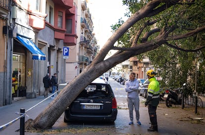 El rugir del viento, el baile de los ficus gigantescos y el ladrido asustado de los perros. Pablo y Mar, una pareja del Poble Sec de Barcelona, con dos gemelos de ocho años, no ha podido dormir pendiente de las ventanas y las persianas. Ahora es mediodía y desde el balcón se ve como los árboles siguen agitadísimos y los técnicos de parques y jardines talan dos enormes ejemplares. Marta, profesora de historia del Instituto Milà i Fontanals, no ha podido examinar de Renacimiento y Barroco a sus alumnos de Segundo Bachillerato y ahora está en casa con su hijo y un amigo de éste, vestidos con la camiseta del Barça, con los planes patas arriba. “Un poco si me ha recordado a la pandemia”, conviene, “sobre todo por esa sensación de incerteza”.