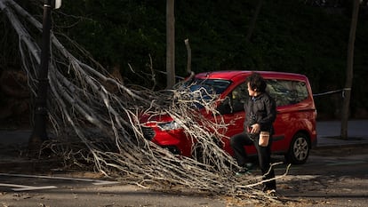 “Iba tranquilamente al trabajo y de repente me he encontrado con la palmera encima. Por suerte no me ha pasado nada”, ha explicado en Tv3 Sandra García, una conductora que ha visto como el árbol se desplomaba sobre la parte posterior de su vehículo en la N-II en Mataró. Ese accidente se ha multiplicado y reproducido por todas partes. Jaime, de 60 años, ha aparcado a las 7.00 de la mañana su coche en la calle Vallhonrat, en Barcelona. Ha ido a desayunar a casa con su familia y cuando ha vuelto a a recoger el coche para ir a trabajar en una obra en Sant Joan Despí un árbol se ha derrumbado sobre la parte posterior del vehículo, aboyándolo y rompiendo la luna posterior. “El viento ha soplado muy fuerte. No lo había visto nunca”, explica que tampoco en Perú, su país de origen. El seguro le ha avisado de que en principio no le cubirirá la reparación pese a que es un siniestro provocado por una catástrofe.