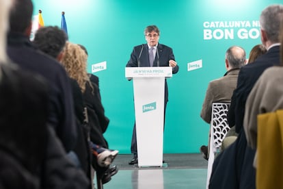 El presidente de Junts per Catalunya, Carles Puigdemont, durante una cumbre del partido en Perpiñán a finales de enero.Glòria Sánchez (Europa Press)