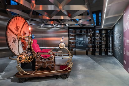Resulta especialmente emocionante que, según cómo miras a través de la estantería, detrás puedes ver la máquina del tiempo. Corremos hacia allí. Es una réplica extraordinaria de la de la película de George Pal, que materializaba maravillosamente la somera descripción de la novela (armazón metálico, con elementos de marfil, de níquel, de cuarzo y de cristal de roca, y un asiento para el viajero, un panel y una palanca para partir hacia el futuro o el pasado). “Solo hay tres, la original, la que se hizo para un episodio de The Big Bang Theory en la que Leonard la compra por Internet creyendo que es una maqueta y lo que le envían es la máquina a tamaño natural, y esta, que hemos hecho construir a un experto en efectos especiales”. La descripción de Penny en la serie es muy injusta: “Parece algo que conduciría Elton John en los Everglades”. Cabe solo un viajero, así que nos subimos por turnos (está permitido). ¿A dónde iría Lalueza? “Ir adelante provoca miedo a lo desconocido. Probablemente iría hacia atrás, a mi época favorita que es la de la Ilustración, conocer a Voltaire, Diderot Rosseau, vestir aquellas pelucas… ¿Y tú? “A conocer a Cleopatra, a ver un T. Rex y el fin de los dinosaurios, tratando de no pisar nada.