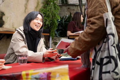 Kang, premio Nobel de Literatura de 2024, una de las más jóvenes en recibirlo (tiene 55 años), optó por no sobrepasarse y fue muy selectiva. Tras su baño de masas en el Centre de Cultura Contemporània de Barcelona (CCCB) a su llegada el martes, donde congregó a unas 700 personas en una charla sobre la empatía con la escritora Mar García Puig, la coreana concentró su presencia en un único punto y se mostró encantada con que la fiesta de Sant Jordi combinase libros y rosas, ya que es amante de la jardinería. Tinta y sangre, que se publica ahora en castellano y catalán, salió en su idioma original entre La vegetariana (2007) y La clase de griego (2011). De la primera ya lleva vendidos unos 80.000 ejemplares en España, lo que la convierte en una superventas. Se notaba. Empezó a firmar a las 11.30 horas, escoltada por su editor en Random, Albert Puigdueta y las dos intérpretes que la acompañaban, las hermanas Esther y Eun Jin. Lo llevó bien.