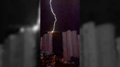 Las espectaculares imágenes no han dejado de correr por las redes sociales desde que varios vecinos captaran el momento justo en que un rayo impactó sobre un rascacielos de Benidorm durante la fuerte tormenta del pasado domingo por la noche. El rayo cayó sobre un lateral de una de las dos torres del Balcón de Poniente, situadas frente a la playa de Poniente de la ciudad alicantina. Según el servicio oficial de la Agencia Estatal de Meteorología (AEMET) en la Comunidad Valenciana, el impacto sobre la Torre II, ubicada en la calle Uruguay, se produjo a las 22.19 horas.