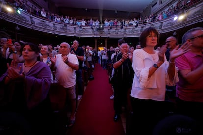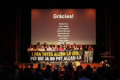 El teatro está en penumbra, pero la emoción es visible en las expresiones de la gente que prácticamente ha llenado el aforo de 900 butacas este sábado por la mañana para asistir al homenaje organizado por la Associació Víctimes Dana 29 d’octubre. Los sentimientos están a flor de piel un año después, cuando se recuerda aquella terrorífica tarde en que “No ens avisaren” (No nos avisaron), como canta con su profundo vozarrón quebrado Miquel Gil, en alusión a que la alarma de las 20.11 llegó demasiado tarde a la ciudadanía.