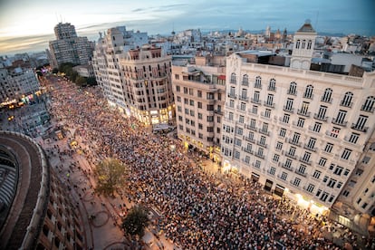 Bajo el lema Mazón dimisión, el mismo que el resto de protestas convocadas durante los últimos 12 meses, la marcha arrancó a la seis y media de la tarde de la plaza de San Agustín de la capital, donde se han oído gritos de “el president, a Picassent”. La Delegación del Gobierno en la Comunidad Valenciana estima en más de 50.000 los asistentes a la protesta que, como en anteriores ocasiones, convocaron más de 200 entidades cívicas, sociales y sindicales en su mayoría de izquierdas de la Comunidad Valenciana, junto a las asociaciones de víctimas de la dana y otras entidades. La Policía Local rebaja la afluencia a 32.000. Se trata, en cualquier caso, de una nueva demostración multitudinaria que recobra la energía ciudadana de las primeras protestas. La presión continúa.
