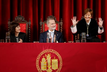 El Rey tenía este martes doble agenda en Valencia. A las diez de la mañana ha presidido en el Paraninfo de la Universitat de València el acto de apertura estatal del curso académico 2025-2026 de las universidades españolas, que debía haberse celebrado el pasado 30 de septiembre pero que fue aplazado por el aviso rojo por lluvias que se activo aquel día. Y a mediodía ha presidido, como cada año, la entrega de los premios Rey Jaime I en la Lonja de los Mercaderes, uno de los galardones mejor remunerados de España.