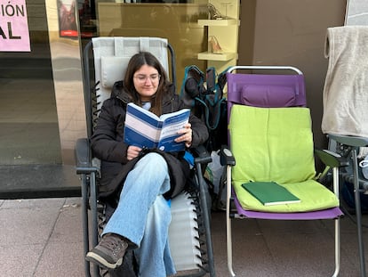La sexta en orden de cola es Ana, estudiante de 23 años. Se ha traído un libro para distraerse y que el tiempo pase más deprisa. Le ha tocado el turno del lunes por la mañana porque se alterna con su novio, que es quien aspira a otro de los áticos. “Se va a trabajar a las dos de la tarde y está descansando un poco porque ha pasado la noche en la hamaca”, especifica. La pareja se turna junto con la madre de él. Llevan de guardia desde el domingo a mediodía porque oyeron que ya había gente a la puerta y querían elegir piso. Concretamente, uno de los áticos, y como no hay muchos, querían asegurarse.