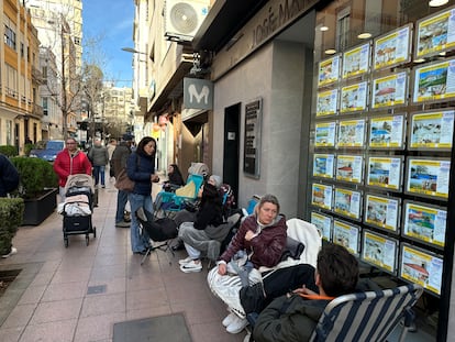 Miriam Segura, de 28 años, y su novio Nico llevan acampados día y noche desde las siete de la mañana del pasado sábado a las puertas de una agencia inmobiliaria en el municipio valenciano de Alzira (48.236 habitantes) porque este martes, 17 de febrero, se abre el plazo para la prerreserva de 123 pisos de promoción pública que lanza la promotora valenciana Iferga en una de las zonas en auge de esta población situada a 45 kilómetros de València. Desde entonces se turnan, con ayuda de los padres incluso, para que la espera no se haga tan dura. Los precios del mercado normal son inalcanzables para ellos. “No puede ser que tenga que esperar hasta los 40 años para comprarme una casa”, expone esta joven.