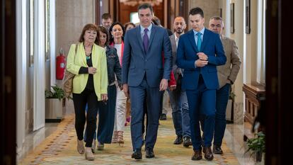 El presente inmediato no favorece a la izquierda, pero Sánchez redundó en un mensaje de optimismo frente al abatimiento y apatía que se han ido extendiendo en el PSOE. “Es el presidente el que nos da ánimos, es impresionante su resiliencia”, comparten varios ministros. Sánchez repasó la gestión del Gobierno, con 140 iniciativas legislativas y dos Presupuestos aprobados “en tiempo y forma”, para tratar de insuflar ánimos tanto a los cuadros del PSOE como a su electorado frente a una oposición “destructiva”. “La derecha y la extrema derecha alimentan cada semana una bronca política artificial. Buscan desanimar, cuando no desmovilizar, a la España progresista y por eso tratan de abrumar a los ciudadanos con un ruido ensordecedor. Alimentan ese ruido para no hablar de su voto en contra de la subida de pensiones o de rebajar en 20 céntimos el carburante. No podemos caer en su trampa, debemos argumentarles con pasión, sin gritos y con serenidad”, instó a los diputados y senadores sin diferenciar al PP de Vox.