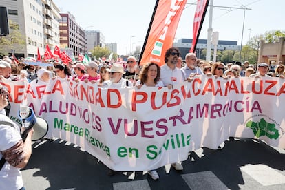 Miles de andaluces han vuelto a salir a las calles de las ocho capitales de la comunidad este domingo en protesta por el deterioro de la sanidad pública, de competencia autonómica. Es la novena vez desde que, en noviembre de 2022, meses después de la histórica mayoría absoluta del popular Juan Manuel Moreno, Marea Blanca convocara a los ciudadanos a visibilizar su malestar por el colapso de la atención primaria y la privatización del sistema de salud. Cuatro años después, el estado de los servicios sanitarios públicos no ha mejorado -tal y como evidencia el CIS andaluz, donde la sanidad se ha convertido en el primera preocupación, por delante del paro-, pero este domingo entre los manifestantes sí ha asomado por encima de su frustración cierta esperanza en que las elecciones del 17 de mayo puedan ser un punto de inflexión donde se canalice la profunda preocupación por el desmantelamiento de un sistema de salud, que ya venía lastrado por los recortes aplicados por los gobiernos socialistas con la gran recesión. “Ojalá esto sea un baño de realidad en las urnas”, decía María Dolores Sánchez, docente de 43 años que ha acudido a la movilización de Sevilla desde Guillena acompañando a sus padres.