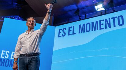 Todo fueron palabras conciliadoras en el idílico discurso de Feijóo. El líder popular aseguró que su propósito no es ni mucho menos “liderar un bloque de partidos contra otro”, sino congregar a todos aquellos que “están entre unos y otros”, a ese pueblo llano que cree “en el entendimiento y no en el enfrentamiento que ve en el Congreso y el Senado”. Él se presenta como un hombre que busca “unir a los españoles más que ser presidente del Gobierno”; que promete “trabajar para la nación, no para ningún partido político” y sin “ningún ánimo de revancha”; que en sus años en Galicia lograba concitar el apoyo de gentes que en otras elecciones votaban al PSOE e incluso al nacionalismo, y que, en definitiva, viene con la misión de fomentar el “respeto entre las lenguas y culturas” de España y “reconstruir su unidad económica, social e institucional”. Un líder que no desea alcanzar el poder “de cualquier manera” sino a través de una “mayoría suficiente” —no llegó a decir absoluta, aunque parecía deducirse— que le permitiría gobernar en solitario sin depender de pactos con nadie. Y así por fin el país podría disfrutar de un presidente que, a diferencia de Sánchez, diría “la verdad a los españoles”.