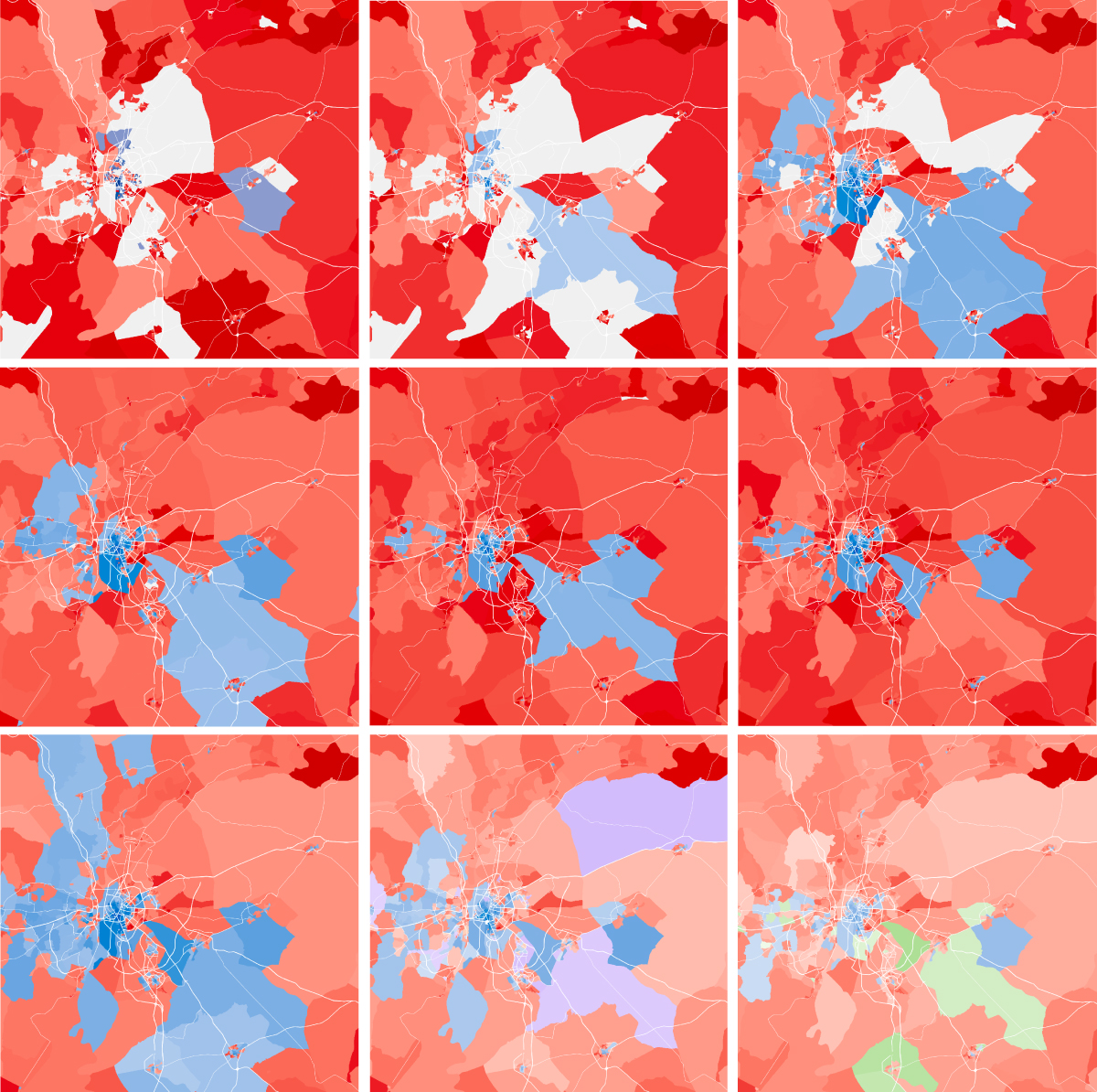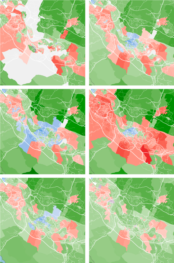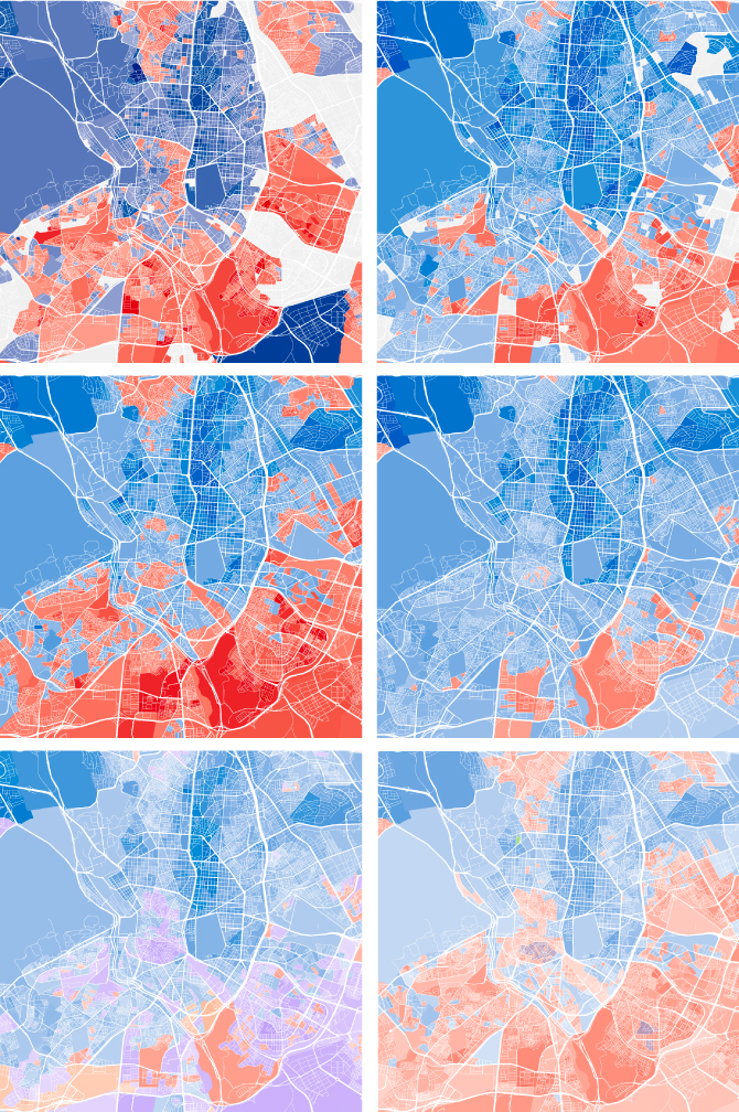A continuación, nos fijamos en cinco zonas de España para mostrar cómo han votado sus barrios en estos 40 años.