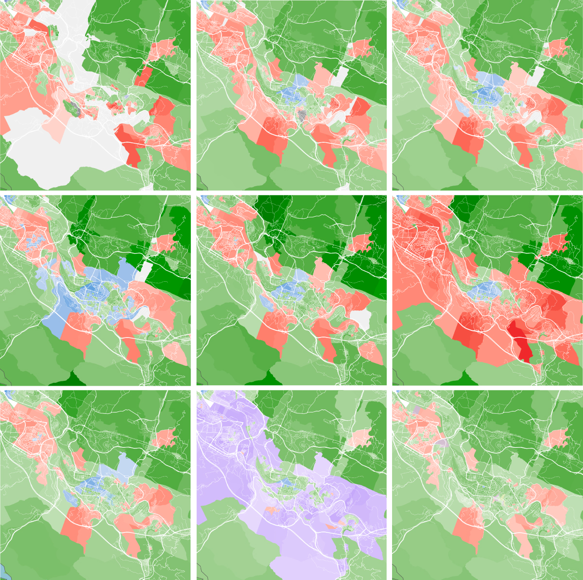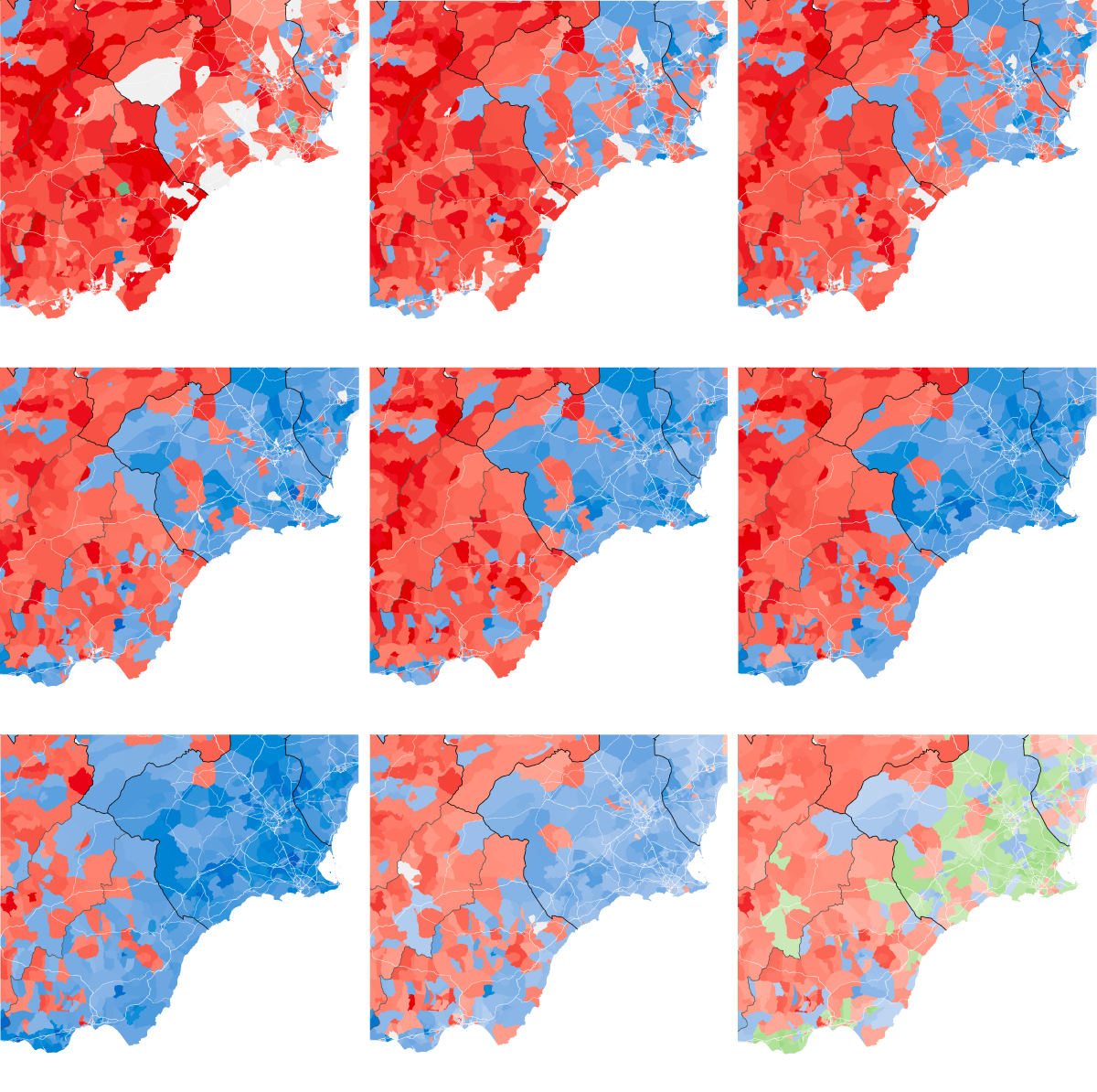 Al no haber encontrado ningún registro de estos cambios, solo hemos podido resolver dos casos limitados. Primero, los municipios que contaban con una única sección y ahora cuentan con varias: para estos municipios hemos agrupado la cartografía de estas secciones en la del municipio. Y segundo, municipios que contaban con varias secciones y ahora solo cuentan con una: para estos lugares hemos agregado los votos de las diferentes mesas de la localidad.