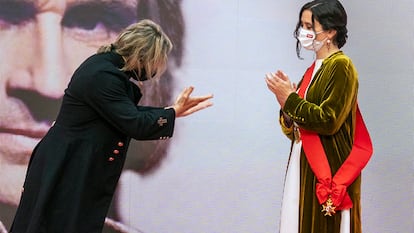 “El nombre del milagro de la cultura en Madrid tiene piernas, cabeza y corazón”, dice sobre Diaz Ayuso Nacho Cano, el fundador del grupo musical Mecano, que recibe la Gran Cruz regional y agradece que la cultura haya seguido abierta en la región pese a la pandemia. “Mis empleados han podido conservar su puesto de trabajo porque tú no cerraste”, insiste, saltándose el protocolo. “Gente que vota a Podemos, a Vox, a todos los lados, me han dicho, si ves a la presidenta, dos palabras: gracias y valiente. Por ser tan buena presidenta, la medalla te la mereces tú”, remata mientras le coloca a Díaz Ayuso la faja que ella le ha puesto a él como premiado, convirtiendo el homenaje a los caídos contra los franceses en 1808 en el mejor cierre de campaña para la candidata del PP.