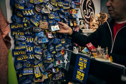 Pero el fuerte de Óscar Martarelli, la razón por la que se habla de él y de su tienda A Rúa en todos los Caminos, son los parches cuentakilómetros “a la carta” para pegar o coser en las mochilas. Un día se puso a contarlos y sabe que tiene ya más de 1.700 referencias. Encarga todo a un taller de Portugal y es difícil que se le escape alguna ruta de peregrinación en el planeta. O que le falte la bandera de algún país. O algún punto de partida hacia Santiago con los kilómetros exactos del recorrido.