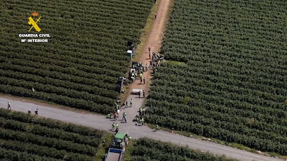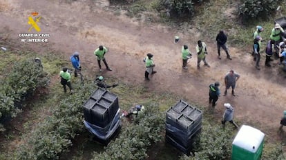 De los 92 temporeros inmigrantes que la Guardia Civil logró identificar en esta plantación de arándanos el 21 de agosto de 2024, solo una decena tenía papeles. Otra treintena de hombres huyeron campo a través y no se pudo revisar su situación. La titular del juzgado de instrucción número 2 de Vilalba (Lugo) investiga a tres responsables de las dos empresas que los captaron y contrataron. Procedentes en su mayoría de Senegal, los jornaleros aseguran que cobraban en metálico entre siete y ocho euros por hora. Pasaban hasta 10 horas en la finca, encadenados a una dura tarea a la intemperie para la que no hay máquina que valga. “La recolección de arándanos tiene que hacerse de forma manual y en grandes plantaciones exige mucha productividad”, explica un pequeño productor gallego de frutos rojos.