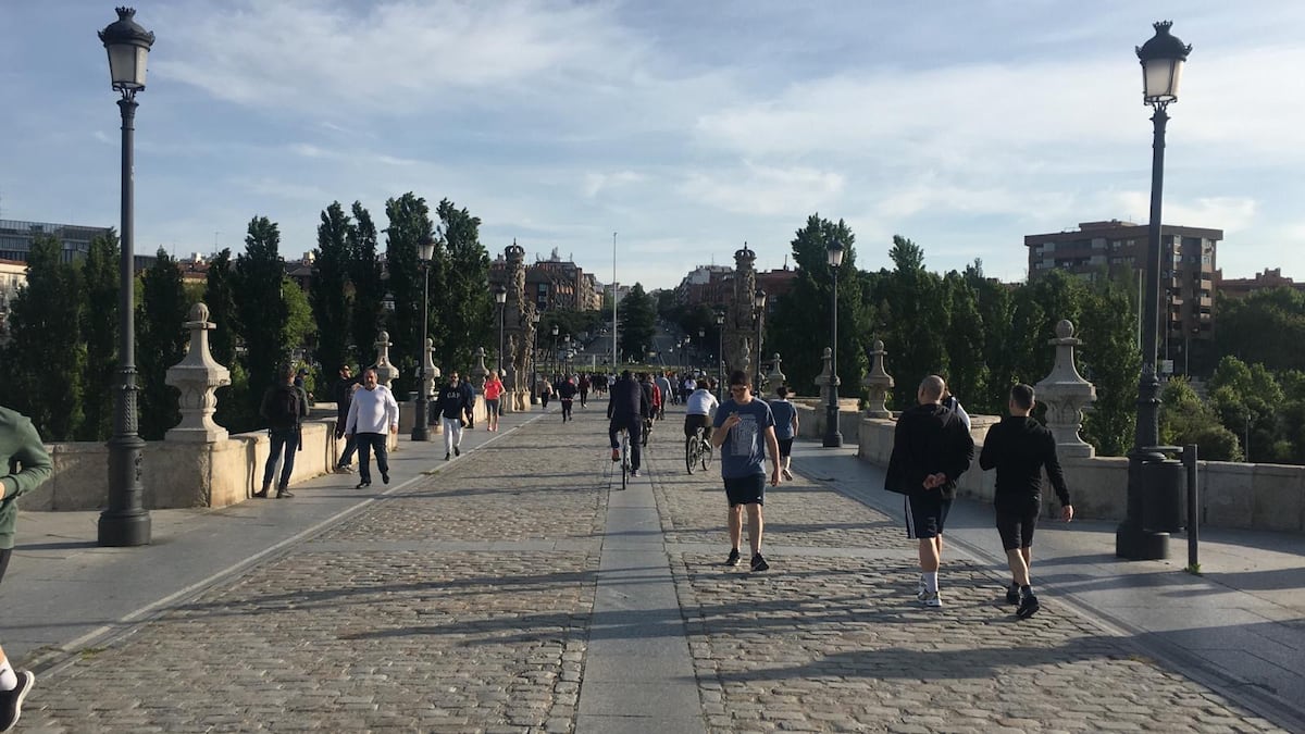 El Puente de Toledo, con sus nueve ojos y sus 180 metros de largo, era un ir y venir constante de runners, ciclistas, paseantes. Si el ancho ya de por sí es reducido, un coche patrulla circulaba de punta a punta vigilando los excesos y reduciendo aún más el espacio para hacer ejercicio. El debate de la mayoría de los ciudadanos estaba en la reapertura de los parques. Jose Luis y Paloma, 48 y 52 años, salieron de casa a las 9.30. Dicen que a las 7.00 muchos ciudadanos se saltaron la prohibición y accedieron al parque. “Lo tienen que abrir. Es necesario para evitar las aglomeraciones”. La patrulla policial, no obstante, volvió a activar el altavoz ante la afluencia de gente cruzando el puente:
