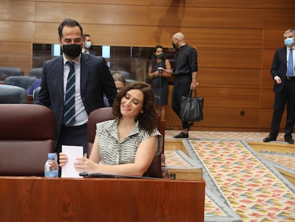 La presidenta regional, Isabel Díaz Ayuso, celebra este miércoles en la Puerta del Sol el primer aniversario de coalición de Gobierno con Ciudadanos, pero no ha dejado claro si reeditaría el acuerdo. “Ahora mismo mis compañeros de viaje son Ciudadanos”, ha dicho la presidenta, en una entrevista en Telemadrid, sobre una repetición del pacto en unas hipotéticas nuevas elecciones. Ayuso, como anunció la semana pasada en el pleno de la Asamblea, prepara una crisis de Gobierno que le garantice los presupuestos para el próximo año, tal y como le sugirió Vox. “Mis consejeros son imprescindibles, pero me comprometo a reducir la administración, si se puede”, afirmó. La portavoz de la formación de Santiago Abascal en la región, Rocío Monasterio, garantiza su apoyo a los presupuestos siempre y cuando la presidenta reduzca el número de sus 13 consejerías.